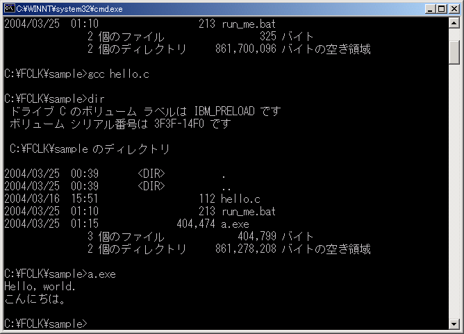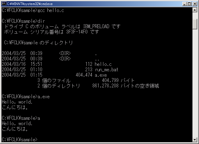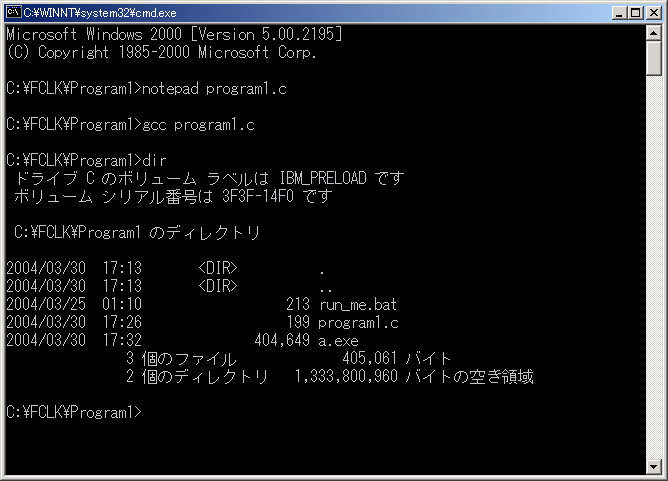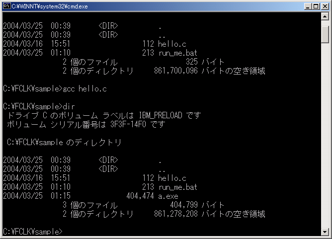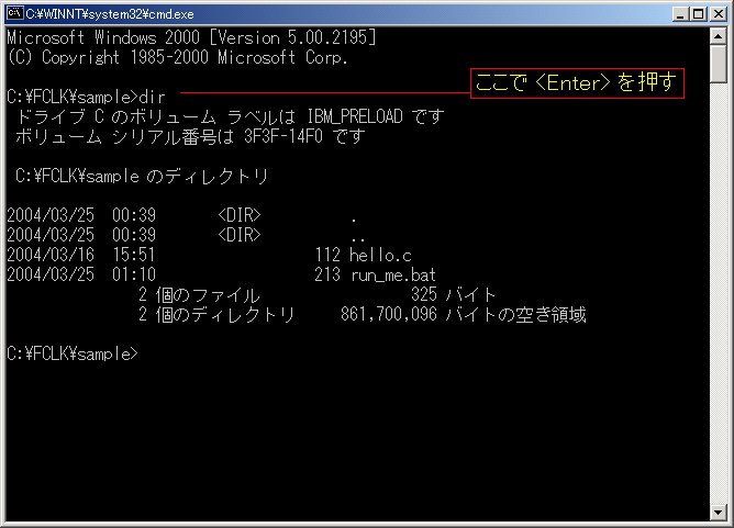 画面を参照(パソコンによって表示が多少変わることがあります)。dirは、現在のフォルダ(この場合C:\FCLK\sample)にあ るものをリストするコマンドです。コマンドは、コマンドラインで入力した後、Enterキーを押すことによって実行されます。