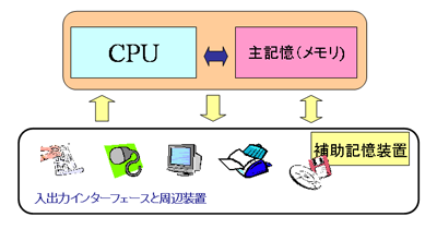 コンピュータのこの他の構成要素は周辺装置と呼ばれ、入出力インターフェースを介して接続されている。