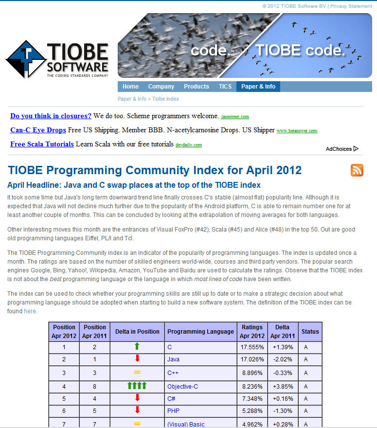 おまけ:プログラミング演習コラム by大川タッチタイピング情報技術者を志すものであれば、必ず身に着ける必要がある。プログラミングや書類の作成において、必要になる技術なので、身に着けて損はないというか、必ず身に着けるべし。 私はインターネット上のタイピング練習(無料)サイトで身に着けた(あと、当時流行した北斗の拳タイピング)。身に着けることで受ける利益は大変大きい。 C++を学ぶ意義コンピュータの動きを理解するためにはC言語を学ぶと良い。それは、基本的にマイクロプロセッサが出来る事は「メモリに対して読み書きし演算することだけ」ということが理解できるからである。メモリ上の数値をいじくるだけで、これだけ多彩なことが出来る、という発見は大きな驚きだと思う。 変数はメモリ上に配置されるものである、という理解があれば、ポインタというのはメモリ上に配置された変数のアドレスなのだ、と納得できるであろう。理解が難しいとされるポインタも大したことはない。より納得感を得るためには、アセンブリ言語も学ぶと良い。(情報工学実験Iのマイコン実習の理解を深めればよい) さてそれでは、C++を学ぶ意義とは何か? 「C++は、1983年にベル研究所のコンピュータ科学者であったビャーネ・ストロヴストルップが、C言語の拡張として開発した。(出典:Wikipedia日本語版)」 その後、長い期間、世界中で使われているからには何らかの理由があるはずである。 自分にとってどのような良いことがあるかは、各自で考えて欲しい。ただここでは、いくつかの情報を示すこととする。 世の中で使われている開発言語(世界編)TIOBE Programming Community Index April2012 ![]() 世の中で使われている開発言語(日本編)プログラミング言語別 年収・求人数ランキング(2010年版) 【株式会社ワークポート調べ「2010年IT業界の転職市場」】![]() |