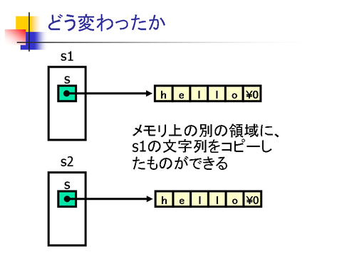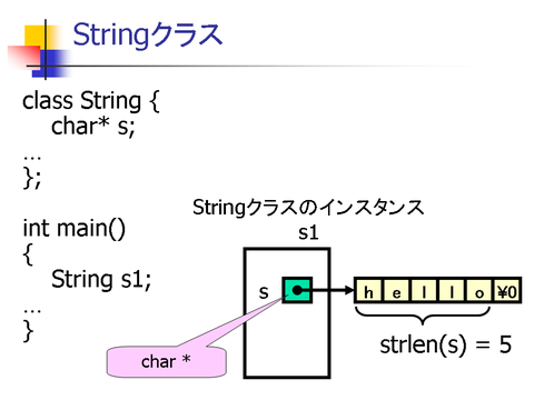 • 入力された文字列をStringクラスのメンバ変数sに格納するために、void setString(const char* n)のようなメンバ関数を作成する。