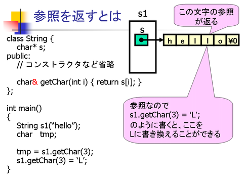 • getCharを参照を返さないように変更するとどうなるか試してみなさい。