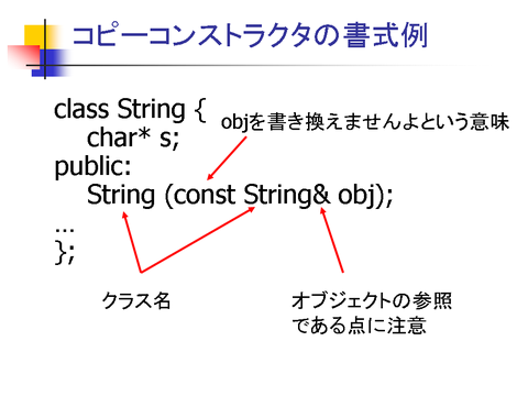 コピーコンストラクタは、引数として同じクラスのオブジェクトの参照をとる、コンストラクタです。