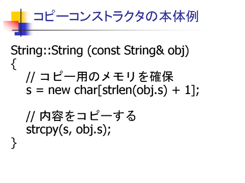 つまり、コピーによる初期化の際に、オブジェクトがポインタを含む場合、単純なコピーでは問題が生じる場合があるわけです。