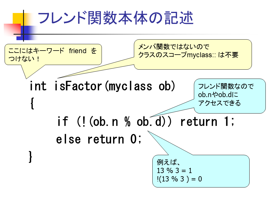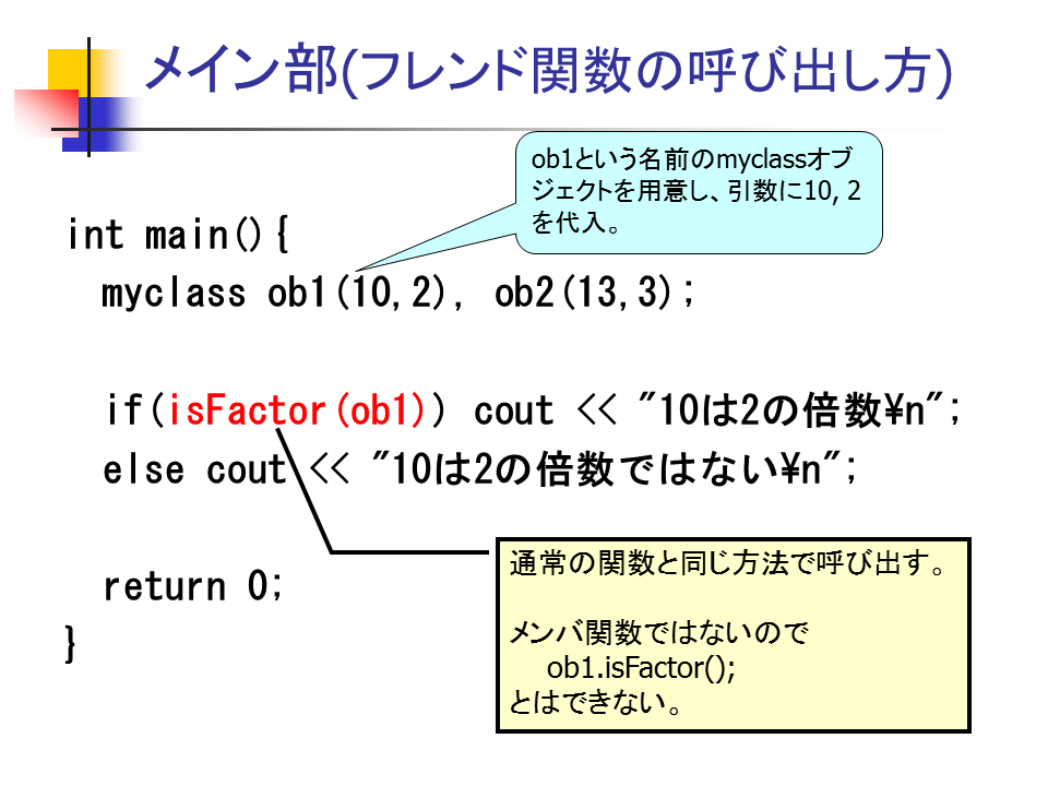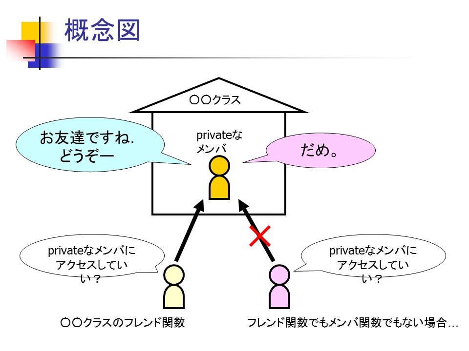 こうした要求に応えるために、C++には、関数をあるクラスのメンバにすることなく、関数からそのクラスの非公開部にアクセスする機能が用意されています。その機能がフレンド関数(friend function)です。