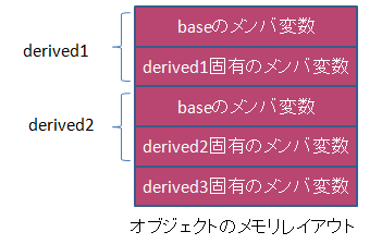 class base { int a; }; class derived1 : public base { ... }; class derived2 : public base { ... }; class derived3 : public derived1, public derived2 { ... };このように作成されたderived3クラスのメモリレイアウトは以下のようになり、baseクラスのメンバが重複して含まれます。baseクラスのメンバ a にアクセスしようとしたときには、先の重複したメンバ名と同一のあいまいさが発生します。この場合には、derived1::a, derived2::a のようにスコープ解決演算子を使って、あいまいさを解消する必要があります。
