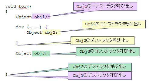 コンストラクタは、それぞれのオブジェクトが定義された時点で呼び出されます。obj1とobj3のデストラクタは、関数 foo から抜ける時点で呼び出されます。obj2 は forループのブロック内で定義されていますので、forループから抜ける時にデストラクタが呼ばれます。