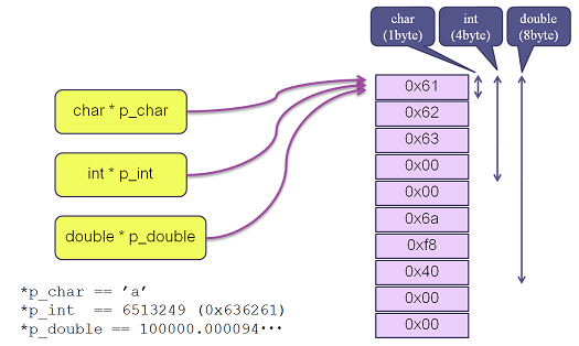 常にアドレスしか格納していないにもかかわらず、ポインタ変数にも型があります。ポインタ変数における型とは、そのポインタが指している先(ポインタに格納されたアドレスの内容)を、どのように解釈しなければならないかを表しています。