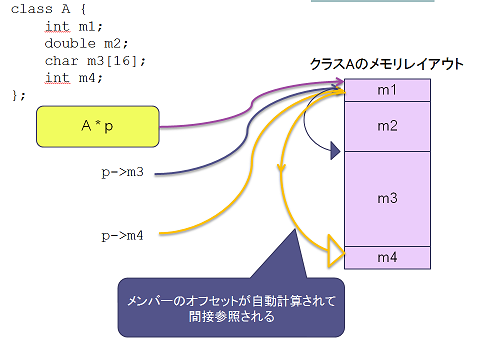 メモリ上のクラスAのオブジェクトをポインタ p が指しています。この時、p->m3 のようにメンバの参照を行うと、メモリレイアウト上でのメンバm3の位置のずれ(オフセット)がコンパイラによって自動的に加算されてから間接参照が行われます。