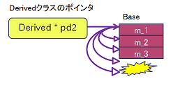 class Base { public: int m_1; int m_2; int m_3; void function() { ... } }; class Derived : public Base { public: int m_4; int m_5; void function() { ... } //Baseのメンバ関数を再定義 };この時に、Derivedクラスのオブジェクトを指すのに、Baseクラスを指すポインタを使用しても良いということです。