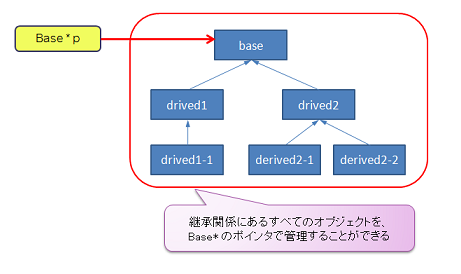 このようにC++では、継承関係にあるすべてのオブジェクトを、基本クラスのポインタを使用して管理できるようになっています。