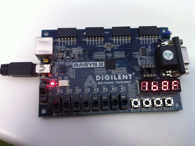 ハードウェア記述言語(HDL: Hardware Description Language)を使用したハードウェア(ディジタル論理回路)の設計手法を学習する。また、学習用FPGA ボードとHDL シミュレータによる回路の動作検証を通して、実際にハードウェアがどのように動作するのか理解する。(実験指導書より)