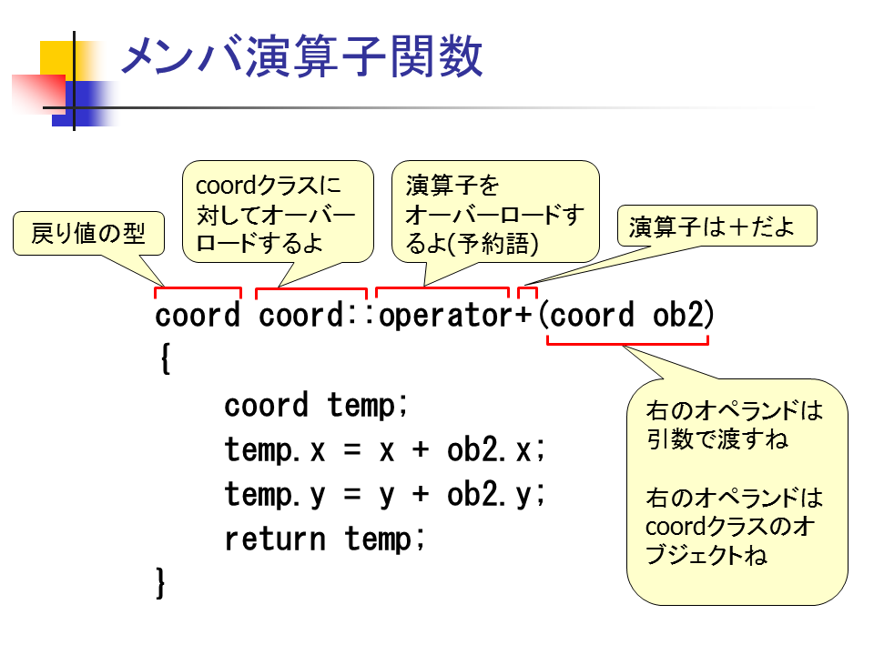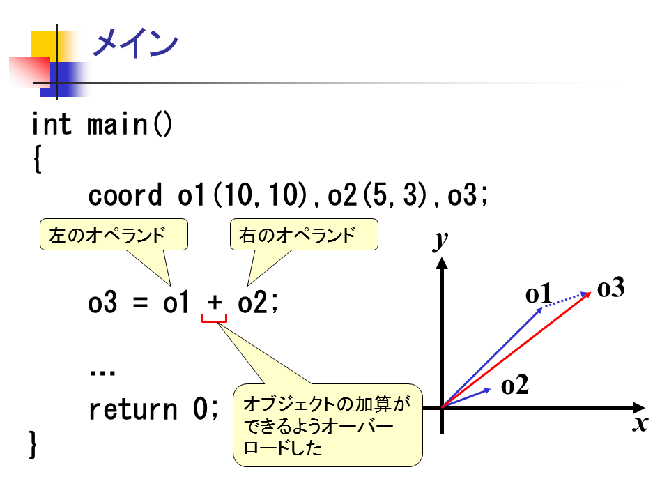 これまでは、int型 + int型 のように組込み型のものどうしの演算しか行っていませんでしたが、演算子をオーバーロードすると 自分で作ったクラスのオブジェクト + 自分で作ったクラスのオブジェクトのように、演算子に新しい意味を追加できます。