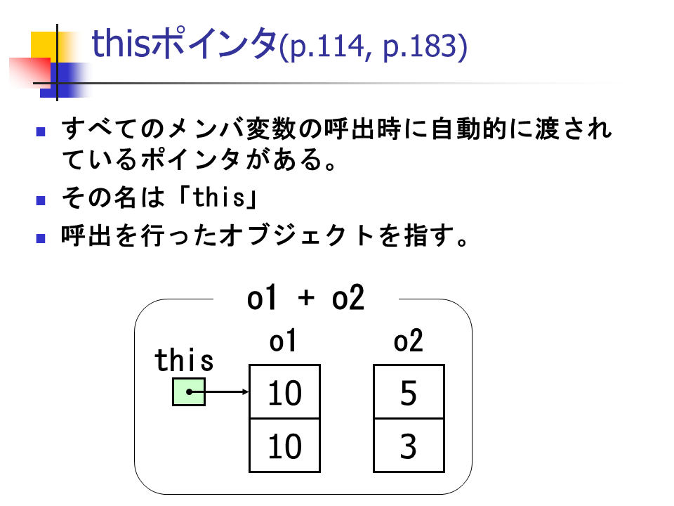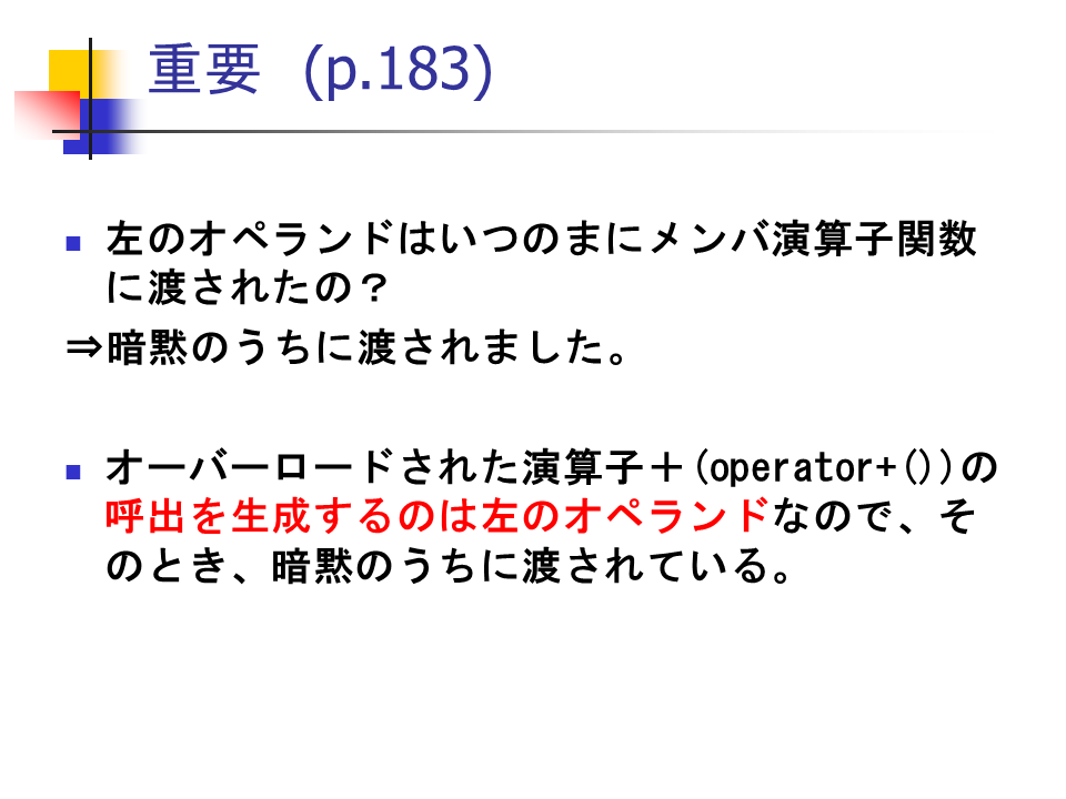 - *thisを返すように作ると、左のオペランドが演算によって変更される。(p.182代入演算子 = 例6.2-2後半)