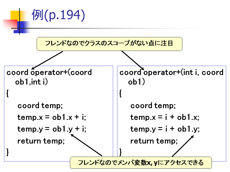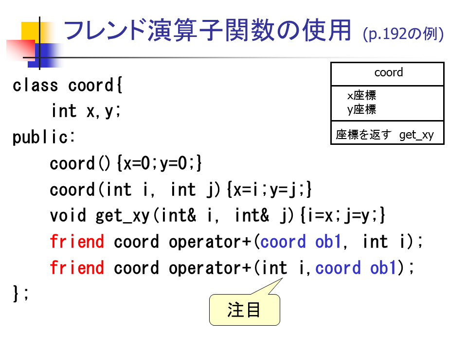 - coordクラスに上記二つのフレンド演算子を追加して実装し、コンパイル、実行してみなさい。