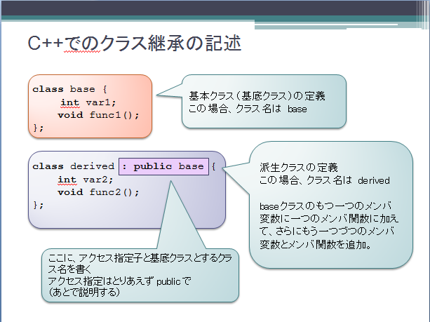 新しく定義する derived という名前のクラス定義を上図のように書くと、base クラスのメンバに加えて、さらにひとつづつのメンバ変数とメンバ関数を加えたクラスを定義することができます。 新しく作成したクラスは、二つのメンバ変数(var1, var2) と、二つのメンバ関数 (func1とfunc2)を持つことになります。
