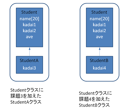 Studentクラスは、学生の名前、課題1、課題2の得点、平均点を管理するクラスでした。ある人はStudentを継承して課題3の得点を管理できるようにしたStudentAクラスを作成したとしましょう。また別のひとは、Studentを継承して課題4の得点を管理できるStudentBクラスを作成したとします。