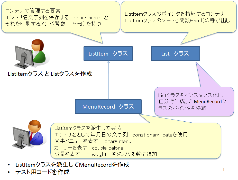 MenuRecord(const char* _date, const char* _menu, int _calorie, int _weight) : イニシャライザ付のコンストラクタ _date : 年月日を表す文字列 (ListItemクラスのメンバ変数 nameを利用する) _menu :食事メニューを表す文字列 _calorie :カロリー(Kcal) _weight :分量(g) 引数で与えられた内容で、メンバ変数を初期化すること。 |