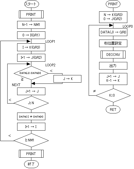 課題8 10進数のソート データ領域(DATA番地)に記憶されている正の10進数のデータを, 小さなものから大きなものの順(昇順という)にソートするプログラムを作成しなさい。 ただし,データを印刷する部分および10進数に変換する部分はサブルーチンとすること。