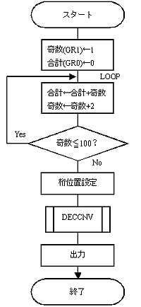 例題8 奇数の合計 1から100までの奇数の合計を10進数で「SUM OF ODD NUMBERS = 02500」のように印刷しなさい。 ただし,10進数に変換する部分はサブルーチンとすること。