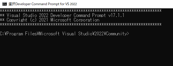 プログラムには、操作の対象となるディレクトリ(フォルダと同義)があり、これをカレントディレクトリと呼びます.コマンドプロンプトを起動すると、左上部に C:\Program Files\...\Community> のようにカレントディレクトリが表示されています。