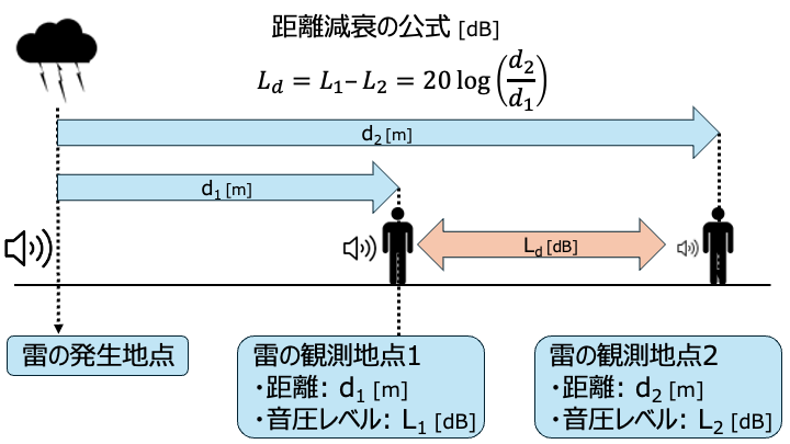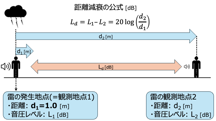 雷を点音源 (十分に小さい音源) とみなした場合,雷の発生地点をd1 [m],雷の観測地点をd2 [m]とすると,雷の観測地点における音圧レベルL2 [dB]は,雷の発生地点での音圧レベルL1 を用いて以下の式で求められる。なお,式中のlogは常用対数であり,底は10であるため省略している。