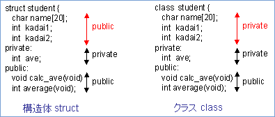 struct Student { public: char name[20]; //氏名 int kadai1; //課題1の点数 int kadai2; //課題2の点数 private: int ave; //平均点 public: void calc_ave(void); //平均点を求める特別な関数 int average(void); //平均点を返す特別な関数 };このように関数も構造体の宣言部で宣言することにより、非公開メンバにもアクセスすることができます。