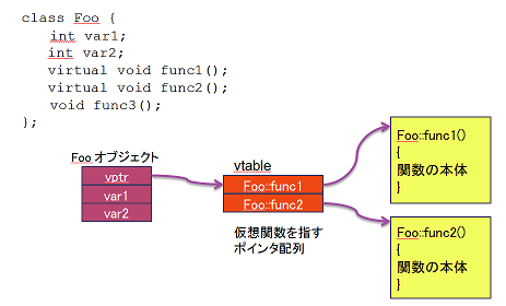 仮想関数は、実行時に呼び出し先関数を決定する仕組みですが、そのために仮想関数テーブル(vtable)と呼ばれる関数ポインタの配列が生成されます。