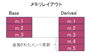 イメージを見てみましょう。上記のように定義したBaseクラスとDerivedクラスのメモリレイアウトは右の図のようになります。