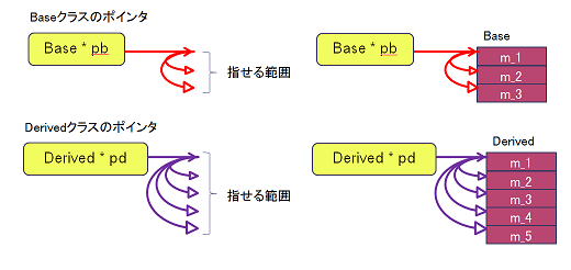 BaseクラスのポインタはBaseクラスが持っているメンバの範囲までアクセスすることができます。Derivedを指すポインタは、さらにDerivedクラス固有のメンバまで指すことができるので、その範囲が広くなっていることが理解できると思います。
