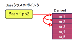 ここで、BaseクラスのポインタでDerivedクラスのオブジェクトを指すと、右の図のようなイメージになります。