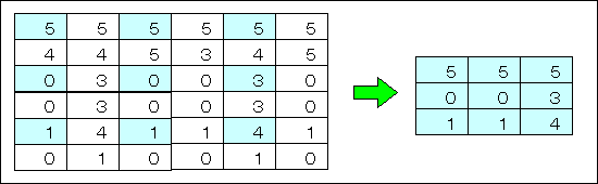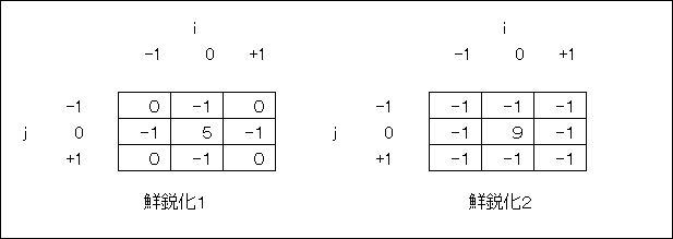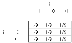原画像中の座標位置(x, y)にある画素値を I(x, y)とし,上記の係数行列 の要素 c(i, j) を用いて i = -1~+1, j = -1~+1について積和演算を行うと,ぼかし処理後の画素値 I'(x, y)が得られる.