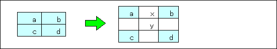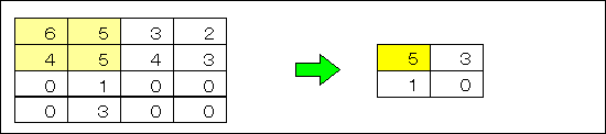 ここでは,線形補間法について説明する.線形補間法では,下図に示すように,原画像上の画素を1画素おき,1ラインおきに配置し,その間の画素を,近傍画素からの線形補間により求めることで,拡大画像を得る.